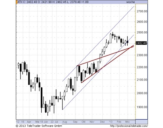 Bis Ende 2012 bildete der ATX einen überkauften Zustand aus. Das Kursziel, die obere Begrenzung des Trendkanals, wurde so gut wie erreicht. Die letzten Rückgänge müssen als Konsolidierung im Aufwärtstrend betrachtet werden. Der Aufwärtstrend ist noch nicht nachhaltig gebrochen.