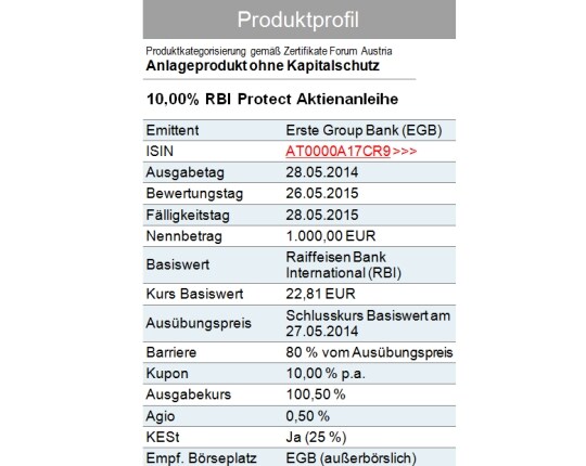 Für Anleger, die von einer Entspannung in der Ukraine und damit einer Kurserholung bei RBI ausgehen, ist die klassische Aktienanleihe (ISIN AT0000A17CP3) interessant, die keinen Protect-Level eingebaut hat. Das etwas größere Risiko wird mit einem höheren Kupon von 10,75 Prozent p.a. ausgeglichen.