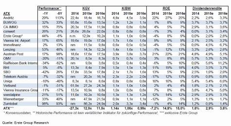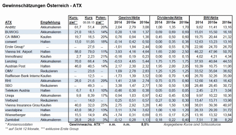 Die Österreichische Post lieferte unspektakuläre Zahlen innerhalb unserer Erwartungen. Mit einer Dividendenrendite von knapp 5% bleibt die Aktie interessant. Vorläufige Zahlen zum abgelaufenen Geschäftsjahr berichtete Immofinanz. Hohe Abschreibungen in Russland und CEE drehen das Ergebnis deutlich ins Minus. Das Unternehmen wird wie erwartet keine Dividende für 2014/15 ausschütten. Dass sich das im kommenden Jahr ändert, daran arbeitet das Management mit Hochdruck. Der aktuelle Kurs steht in keiner Relation zum NAV von EUR 4,19 pro Aktie. Daher bestätigen wir unsere Kaufempfehlung.