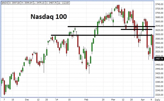 Zum S&P 500: Am vergangenen Donnerstag ging er bei 1.833 Zählern aus dem Handel. Damit wurde die Unterstützung bei 1.840/1.850 Punkten gebrochen, was ein Verkaufssignal darstellt. Zum Nasdaq 100, der aktuell die Abwärtsbewegung anführt: Man erkennt im Chart, dass wichtige Unterstützungen gebrochen wurden. Zunächst die Zone 3.635/3.640 - damit war der vorangegangene Break aus dem Februar über die genannte Zone zu einer Bullenfalle geworden. Spätestens nach dem Rutsch unter 3.600 war die Topbildung komplett. Doch der extrem volatile Nasdaq schlug nochmal zurück, stieg bis ca. 3.775, ließ die Bullen wieder hoffen und "frühe Bären" (diese wurden zahlreich aus Short-Positionen ausgestoppt) jammern. Doch dann kam der nächste Abwärtsschub, gefolgt von einem letzten Pull-back an 3.600.