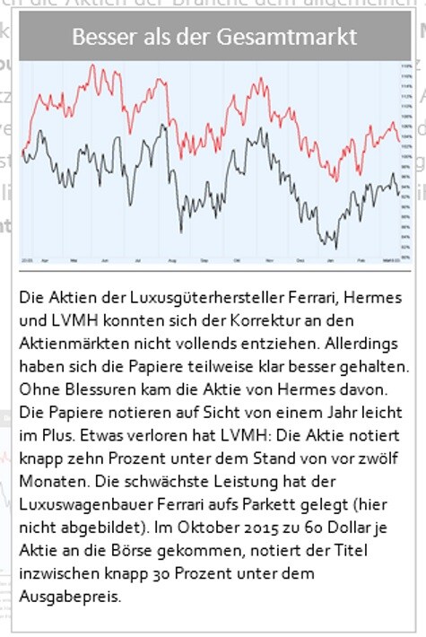 Teure Autos, Marken-Handtaschen, Designermode: Allen Konjunkturängsten zum Trotz steigt die Nachfrage nach Luxusartikeln. Dennoch konnten sich die Aktien der Branche dem allgemeinen Abwärtstrend an den Börsen nicht entziehen. Wer nicht volles Risiko gehen will, könnte sich die Protect Multi Luxus Aktienanleihe (ISIN AT0000A1KCE5 >>>) der Erste Group Bank ansehen. Das Papier sieht im März 2017 einen Kupon von 9,5 Prozent p.a. vor. Zudem kommt es zur Rückzahlung zum Nennwert, wenn keine der drei Aktien LVMH, Ferrari, und Hermes die Barriere von jeweils 60 Prozent verletzt. Sollte das doch passieren, wird am Ende diejenige Aktie mit der geringsten Performance geliefert. Hohe Verluste können also die Folge sein. Wegen des großen Risikopuffers ist ein solches Szenario jedoch wenig wahrscheinlich. Daher ist die Protect Multi Aktienanleihe auch für weniger risikofreudige Anleger geeignet. Weitere Infos unter produkte.erstegroup.com >>>.