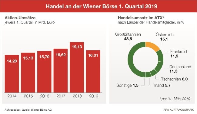 Das erste Quartal im Börsenjahr 2019 war für den Wiener Kapitalmarkt ereignisreich. Das KMU-Segment "direct market plus" startete mit 8 Unternehmen, davon 4 Neu-Listings. Der Februar begann mit Europas erstem Börsengang 2019: Marinomed Biotech AG notiert im Wiener Börse Top-Segment "prime market". Der Aktienumsatz der Wiener Börse beträgt im ersten Quartal 16,01 Mrd. EUR, ein Rückgang von 16,3 % gegenüber dem Vorjahreszeitraum (Q1 2018: 19,13 Mrd. EUR). Europäische Börsen haben im Jänner und Februar Umsatzrückgänge zwischen 20 und 40 % verzeichnet. Mit 5,34 Mrd. EUR liegt der durchschnittliche Monatsumsatz jedoch stabil über dem Fünf-Jahres-Mittel von 5 Mrd. EUR. Das internationale Segment "global market" entwickelt sich entgegen dem Trend und zeigt seit dem Vorjahr fast eine Verdoppelung des Handelsvolumens.