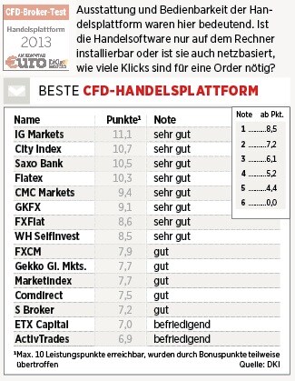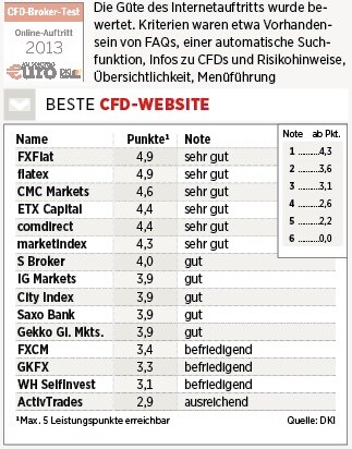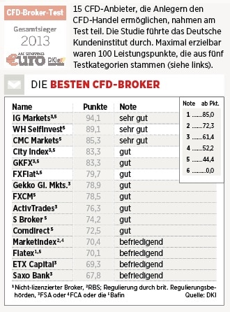 €uro am Sonntag hat zusammen mit dem Deutschen Kundeninstitut in Düsseldorf (DKI) die wichtigsten Anbieter in Deutschland einem gründlichen Test unterzogen. 16 CFD-Häuser wurden angeschrieben, bis auf Alpari nahmen alle teil. Anders als 2012 wurden einige kleinere Anbieter, die kaum Marktanteile haben, diesmal nicht befragt.