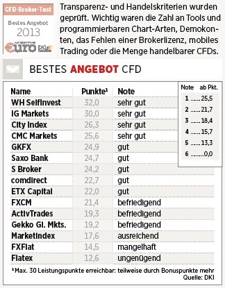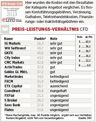 Testkategorien: Das Gesamtergebnis setzt sich aus den Ergebnissen fünf grundlegender Kategorien zusammen: Mit 35 Prozent am stärksten gewichtet wurde die Kategorie „Kundenservice“. Hier wurden vor allem die Ergebnisse aus den Testanfragen per E-Mail und Telefon berücksichtigt, wie zum Beispiel die Schnelligkeit und Freundlichkeit, mit der Anfragen beantwortet wurden. Mit 30 Prozent floss der Umfang des Angebots in die Gesamtwertung ein. Dieser wurde aus den Punkten der beiden Unterkategorien „Transparenz“ und „Handel“ gebildet. Punkte konnten die Anbieter hier insbesondere durch ein großes Angebot handelbarer CFD-Werte und Orderarten sowie vielfältige Analysemöglichkeiten sammeln. Die Kosten wurden mit 20 Prozent gewichtet. Neben der Höhe der Spreads stellten die Kriterien Mindesteinlage, Finanzierungsgebühren beim Halten einer Position über Nacht und Guthabenverzinsung wichtige Aspekte dar. Die Handelsplattform ging mit zehn Prozent in das Gesamtergebnis ein. Bewertet wurde unter anderem die Nutzerfreundlichkeit, etwa ob die Handelsplattform heruntergeladen und auf dem Computer installiert werden kann. Die Kategorie Website wurde mit fünf Prozent am wenigsten gewichtet. Interessenschwerpunkte waren neben der Nutzerfreundlichkeit die Informationen zum CFD-Handel wie Frequently Asked Questions (FAQ), Infobroschüren und Risikohinweise. Als zusätzliche Kategorie wurde das Preis-Leistungs-Verhältnis berechnet, indem die Ergebnisse der Kategorie „Kosten“ zu denen der Kategorie „Angebot“ ins Verhältnis gesetzt wurden. Davon flossen die Kosten mit 20 Punkten in das Gesamtergebnis ein.
