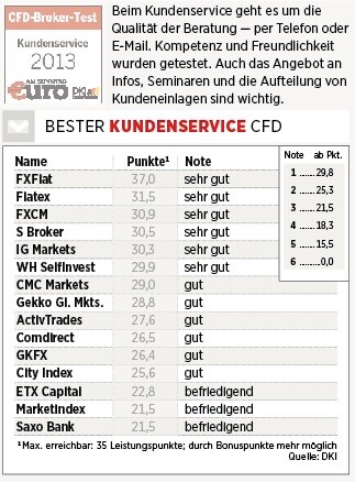 Testverfahren: Das Deutsche Kundeninstitut (DKI) hat im Auftrag von €uro am Sonntag die Dienstleistungsqualität von CFD-Brokern getestet. Die Daten wurden mittels vier verschiedener Methoden erhoben: durch Umfrage bei den Anbietern, Testanfragen per Telefon und E-Mail sowie Analyse der Internetseiten und Handelsplattformen (Demokonten). Insgesamt wurden rund 210 Einzelkriterien in etwa 270 Kundenkontakten geprüft.