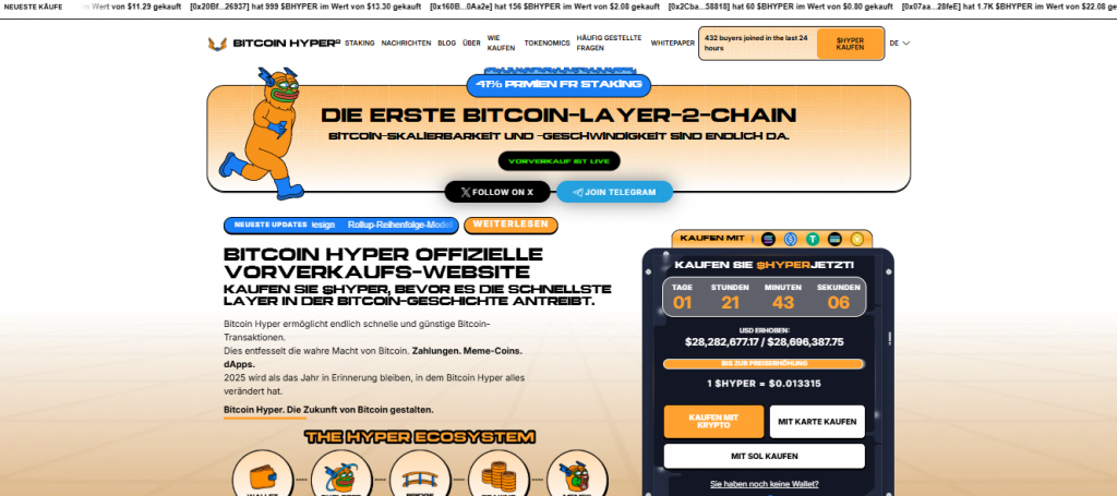 Es besteht kein Zweifel daran, dass Bitcoin Hyper zu den aufstrebenden Kryptowährungen am Krypromarkt gehört. Das Potenzial, das damit in Verbindung steht, wird als äußerst hoch eingestuft. Ein wesentlicher Faktor dabei ist die derzeit noch geringe Marktkapitalisierung des Tokens, die bei initialem Börsenlisting im unteren Millionenbereich liegen wird. Im Vergleich dazu liegt die Marktkapitalisierung des Bitcoins bei rund 1,8 Billionen US-Dollar, die des Dogecoins liegt zudem bei rund 30 Millionen US-Dollar. Entsprechend groß muss die Nachfrage sein, damit sich der Altcoin nochmals in seinem Wert verdoppelt. Experten gehen daher davon aus, dass der im Presale befindliche Token ein Potenzial von Faktor 100 mit sich bringt.