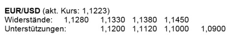 EUR/USD befindet sich weiterhin im langfristigen Abwärtstrend. Sollte der Wechselkurs die Unterstützung bei 1,1200 USD unterschreiten, dann dürfte die Abwärtsbewegung wieder fahrt aufnehmen.