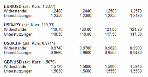 Diese enorme Rallye ist in den letzten Tagen ins Stocken gekommen, was die Möglichkeit einer stärkeren Korrektur mit sich bringt. Bisher sind vor allem Gewinnmitnahmen für den Kursrückgang verantwortlich, denn im Vorfeld der Sitzung der US-Notenbank am 17.12. will kaum jemand ein großes Risiko eingehen, Niemand will auf dem falschen Fuß erwischt werden, schon gar nicht vor den Weihnachtsferien. Es ist daher kein Zufall, dass die Gewinnmitnahmen an den Aktienmärkten mit denen bei USD/JPY zusammentreffen. Die Konjunkturdaten aus Japan beeinflussen den Wechselkurs USD/JPY dagegen derzeit kaum, denn dieser wird vor allem von der Aussicht auf eine Zinserhöhung in den USA im Jahr 2015 und der anhaltend expansiven Geldpolitik der Bank of Japan nach oben getrieben. Trotzdem könnten überraschende Zahlen für Kursausschläge sorgen und die aktuelle Korrektur verstärken oder die Rallye nach oben neu entfachen. Am Donnerstag werden in Japan (01:50 Uhr MEZ) Zahlen zu den Auftragseingängen bei Maschinen und ein Index für den Dienstleistungssektor veröffentlicht. Besser als erwartete Zahlen könnten die Korrektur bei USD/JPY verstärken. Charttechnisch hat sich der Wechselkurs nach dem kurzfristigen Fall auf 118,00 JPY am Dienstag wieder stabilisiert. Erst ein nochmaliger Bruch der Unterstützung bei 118,50 JPY dürfte einen weiteren Abwärtsschub auslösen, vermutlich bis 117,50 JPY. Mittel- und langfristig zeigt die Kursrichtung bei USD/JPY aber weiter nach oben.