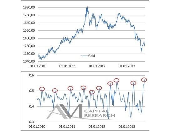 Die erste Grafik zeigt den eigens von A.M. Capital Research entwickelten „Forerunner-Indicator“! Dieser gibt an, wie intensiv sich die Positionierung großer Spekulanten in Future- und Optionsgeschäften verändert hat! De facto lässt sich sagen, dass im Falle einer sehr starken und zahlreichen Wanderung der Anleger aus dem bearishen ins bullishe Lager deutliche Signale für einen baldigen Kursanstieg auszumachen sind!