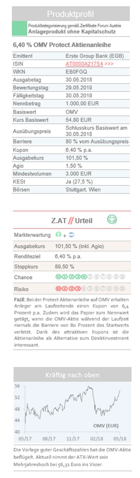 An der Börse sind die Aussagen gut angekommen: Die OMV-Aktie machte sich in Richtung des Jahreshochs auf. Wer sich angesichts dieser Kursgewinne defensiver positionieren möchte, könnte sich eine neue Protect Aktienanleihe (ISIN AT0000A217S4 >>>) der Erste Group Bank ansehen. Das Papier ist mit einem Kupon von 6,4 Prozent ausgestattet, der am Ende der Laufzeit in jedem Fall zur Auszahlung kommt. Zudem wird die Anleihe zum Nennwert getilgt, wenn der Kurs der OMV-Aktie niemals die Barriere bei 80 Prozent verletzt. Andernfalls bekommen Anleger Aktien ins Depot gebucht.