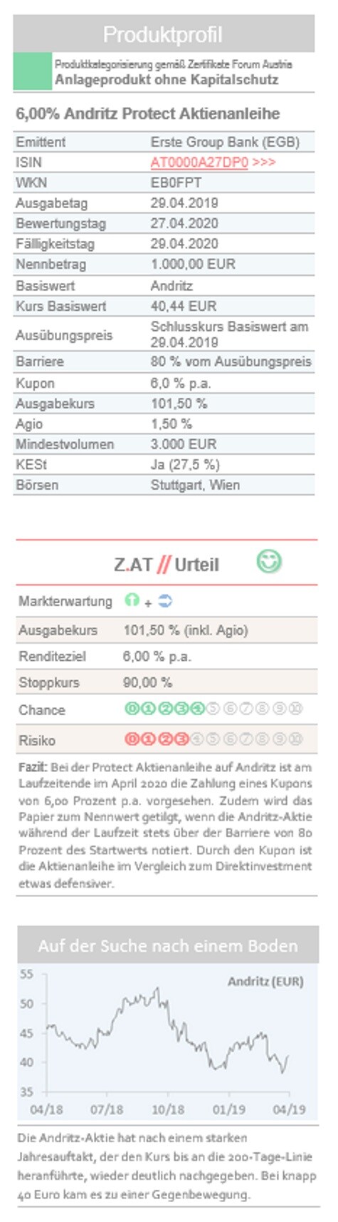 Allein an der Börse spiegeln sich die positiven Perspektiven noch nicht wider. Die Aktie hat nach Zugewinnen im Jänner und Februar wieder deutlich nachgegeben. Daher kann es nicht schaden, sich der Aktie mit Teilschutz zu nähern. Dazu geeignet ist eine neue Protect Aktienanleihe (ISIN AT0000A27DP0 >>>) von der Erste Group Bank auf Andritz. Das Papier ist mit einem Kupon von 6,00 Prozent p.a. ausgestattet, der am Laufzeitende unabhängig von der Kursentwicklung der Andritz-Aktie zur Auszahlung kommt. Zudem wird die Aktienanleihe zum Nennwert getilgt, wenn der Andritz-Kurs niemals die Barriere von 80 Prozent verletzt. Tritt das Negativ-Szenario ein, und der Basiswert notiert am Ende nicht wieder über dem Startpreis, erfolgt die physische Lieferung von Aktien.