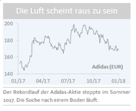 Die aktuelle Geschäftsentwicklung spricht klar für die Deutschen: Im dritten Quartal 2017 hatte Adidas mit 526 Mio. Euro gut 36 Prozent mehr verdient als im Vorjahreszeitraum. Dabei hilft, dass der Konzern viele Produkte verkauft, die eine hohe Marge bringen, zumal Sportmode ohnehin zunehmend im Alltag getragen wird. Die Zahlen für das Gesamtjahr 2017 will Adidas am 14. März präsentieren. Mit einem Turbo Long-Zertifikat von Société Générale setzen spekulativ orientierte Anleger darauf, dass die in den letzten Monaten schwächelnde DAX-Aktie im Sportjahr 2018 wieder nach oben dreht (ISIN DE000SC8CTR8). Der Hebel liegt bei rund vier.