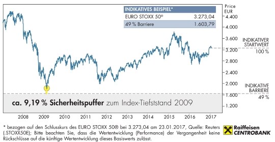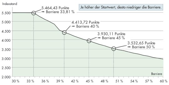 Derzeit notiert der EURO STOXX 50® im Bereich von 3.300 Indexpunkten. Das deutet im Umkehrschluss indikativ auf eine Barriere im Bereich von 1.650 Indexpunkten hin und liegt somit immer noch unter den Indextiefständen vom Frühjahr 2009, dem Höhepunkt der Wirtschafts- und Finanzkrise. Damals lag der Indextiefstand bei 1.765,49 Indexpunkten.