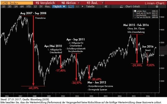 Somit fügt sich das Zertifikat perfekt in das derzeitige Marktumfeld. Politische Risiken wie der Brexit, die griechische Schuldentragödie und Präsident Trump sowie verschiedene ökonomische Unsicherheiten, wie die Konjunktursorgen in China oder der Ölpreisverfall, haben das Börsengeschehen in der jüngsten Vergangenheit geprägt.