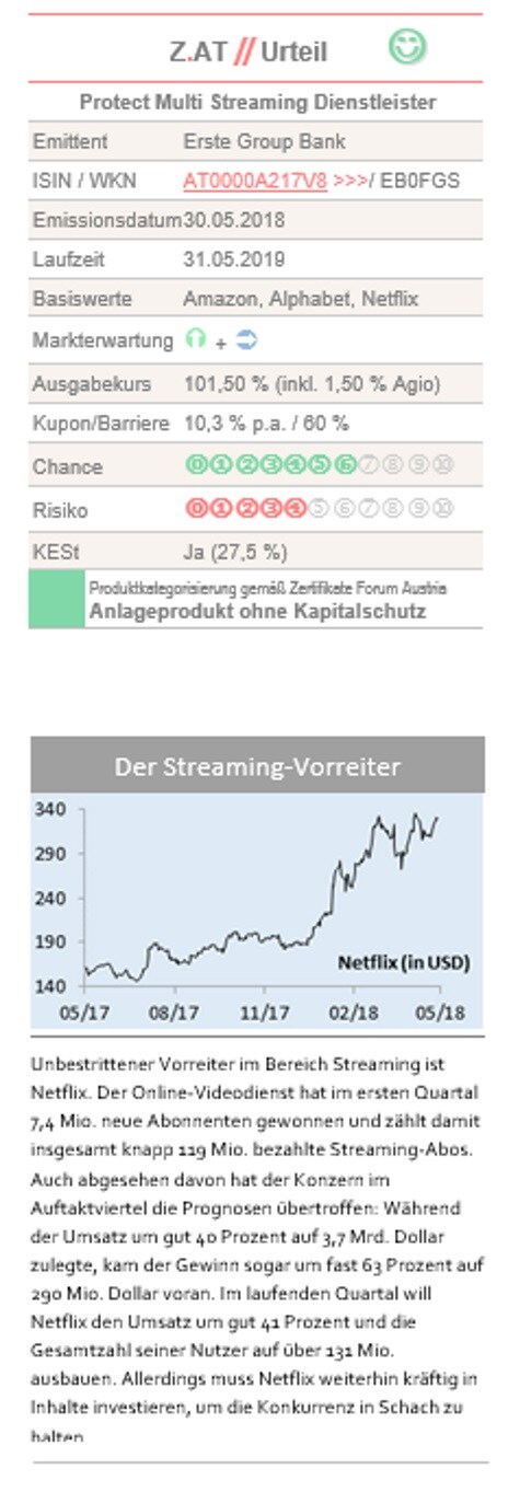 Neuemission: Protect Multi Streaming Dienstleister Aktienanleihe (Erste Group Bank) - Streaming-Vorreiter im Paket mit Risikopuffer