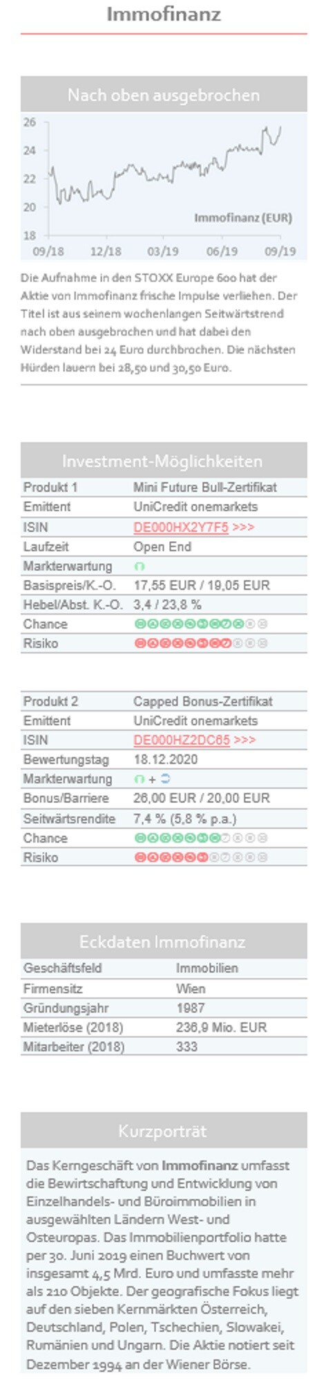 Weil zum Buchwert von aktuell 27,41 Euro je Papier noch Luft ist, könnte ein Mini Future Bull-Zertifikat (ISIN DE000HX2Y7F5 >>>) von UniCredit onemarkets interessant sein. Das Papier bildet Kursbewegungen der Aktie mit einem Hebel von 3,8 ab. Wer dagegen vorsichtiger an die Aktie herangehen möchte, sollte sich einen Puffer einbauen, wie ihn etwa ein Capped Bonus (ISIN DE000HZ2DC65 >>>) von UniCredit onemarkets bietet. Das Papier generiert im Dezember 2020 eine Rendite von 7,4 Prozent, wenn die Anteilscheine von Immofinanz bis zum Laufzeitende stets oberhalb von 22,00 Euro notieren.