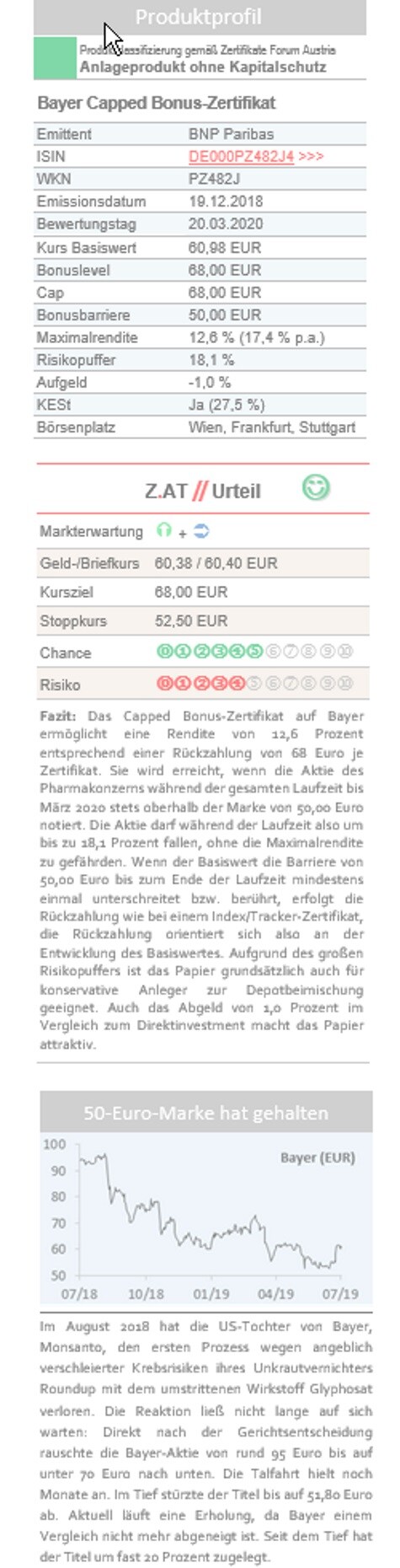 Die Aktie reagierte mit einem Kurssprung: Gegenüber dem im Mai bei 51,80 Euro markierten Mehrjahrestief konnte der Titel bereits um fast 20 Prozent zulegen. Dazu trug auch der Einstieg des Hedgefonds Elliott bei, der für seine aggressive Ein¬mi¬schung ins Management bekannt ist. Der Investor hat Bayer-Aktien für 1,1 Mrd. Euro zusammengekauft. Bislang zeigt sich Elliott-Chef Paul Singer bei Bayer von seiner freundlichen Seite. Er begrüßte die jüngsten Schritte zur Bewältigung der US-Klage¬welle. Elliott ist zuversichtlich, dass die Bildung eines Sonderausschusses der richtige Weg sei, die Probleme zu lösen. Vor diesem Hintergrund ist ein Capped Bonus (ISIN DE000PZ482J4 >>>) von BNP Paribas interessant.