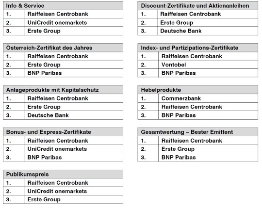 Als Gesamtsieger über insgesamt sieben Kategorien ging zum wiederholten Male die Raiffeisen Centrobank vor Erste Group und BNP Paribas hervor. Das Match um das beste Österreich-Zertifikat des Jahres konnte ebenfalls die Raiffeisen Centrobank trotz Punktegleichheit mit der Erste Group, aber aufgrund der höheren Jury-Wertung für sich entscheiden. Platz 3 ging in dieser Kategorie an BNP Paribas.